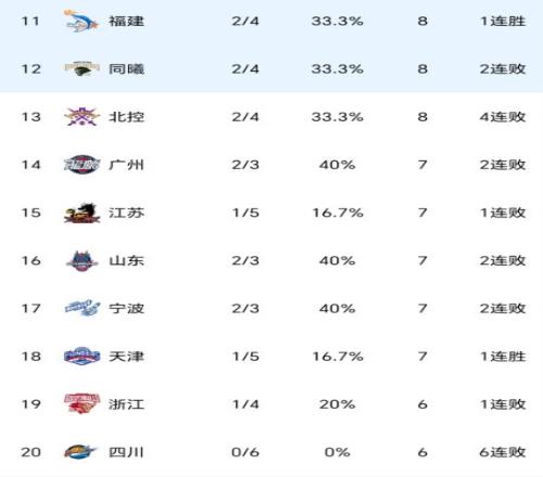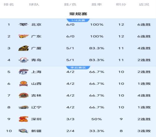北京隊開局五輪全勝,強勢領跑積分榜,因廣廈隊多賽一輪,所以暫時升至第一,只要北京隊繼續(xù)連勝,就能奪回榜首位置。